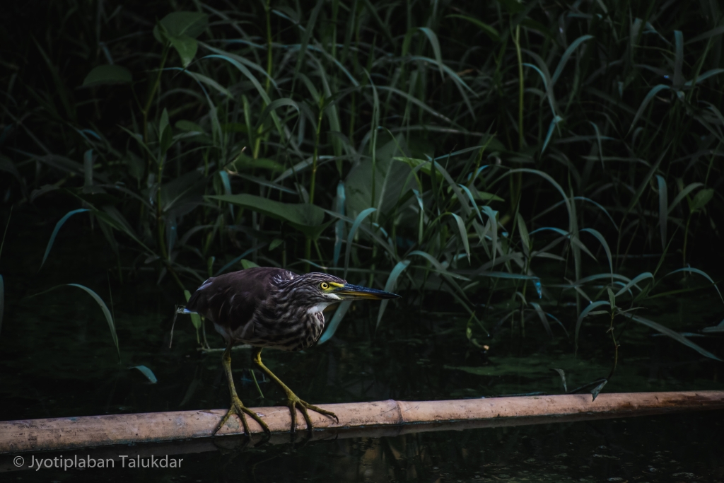 We have a pond beside our house. We have put some local fish like Koi maas, Darikana. We put some bamboo sticks in the pond for our ducks to climb and rest there. One particular evening, through my window, I spotted this bird searching for something. Quickly it plucked a small fish out and gobbled it. After I captured this photo, it spotted me and flew away.