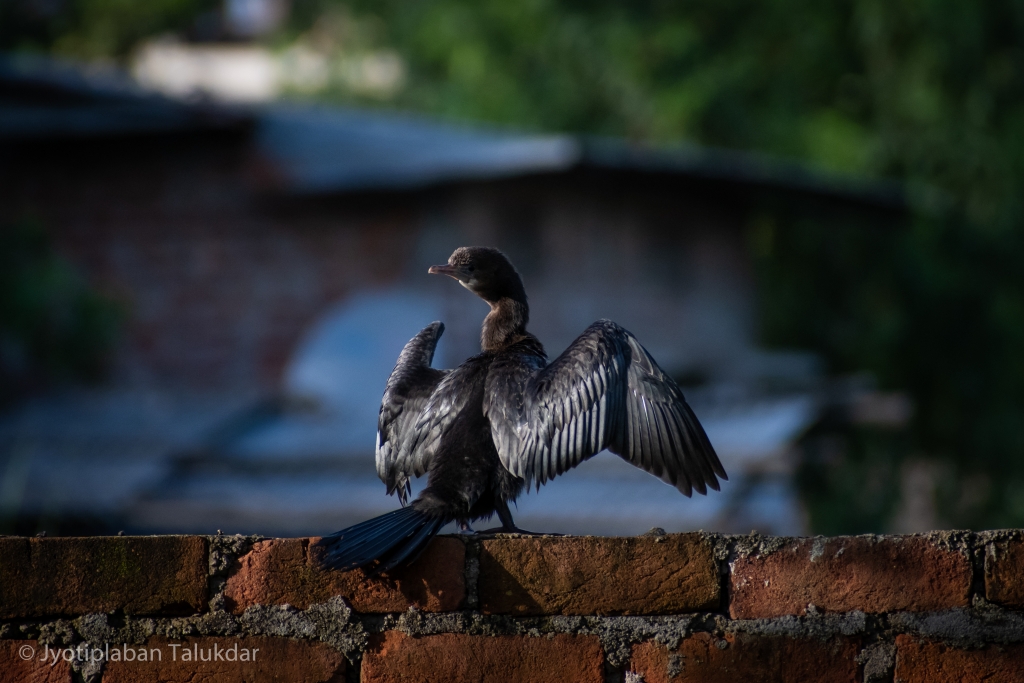 I took my camera and went to photograph him. On realizing I was near, he flew from the bank to a nearby wall and did the same act of spreading wings in the sun. After a while, it flew away.